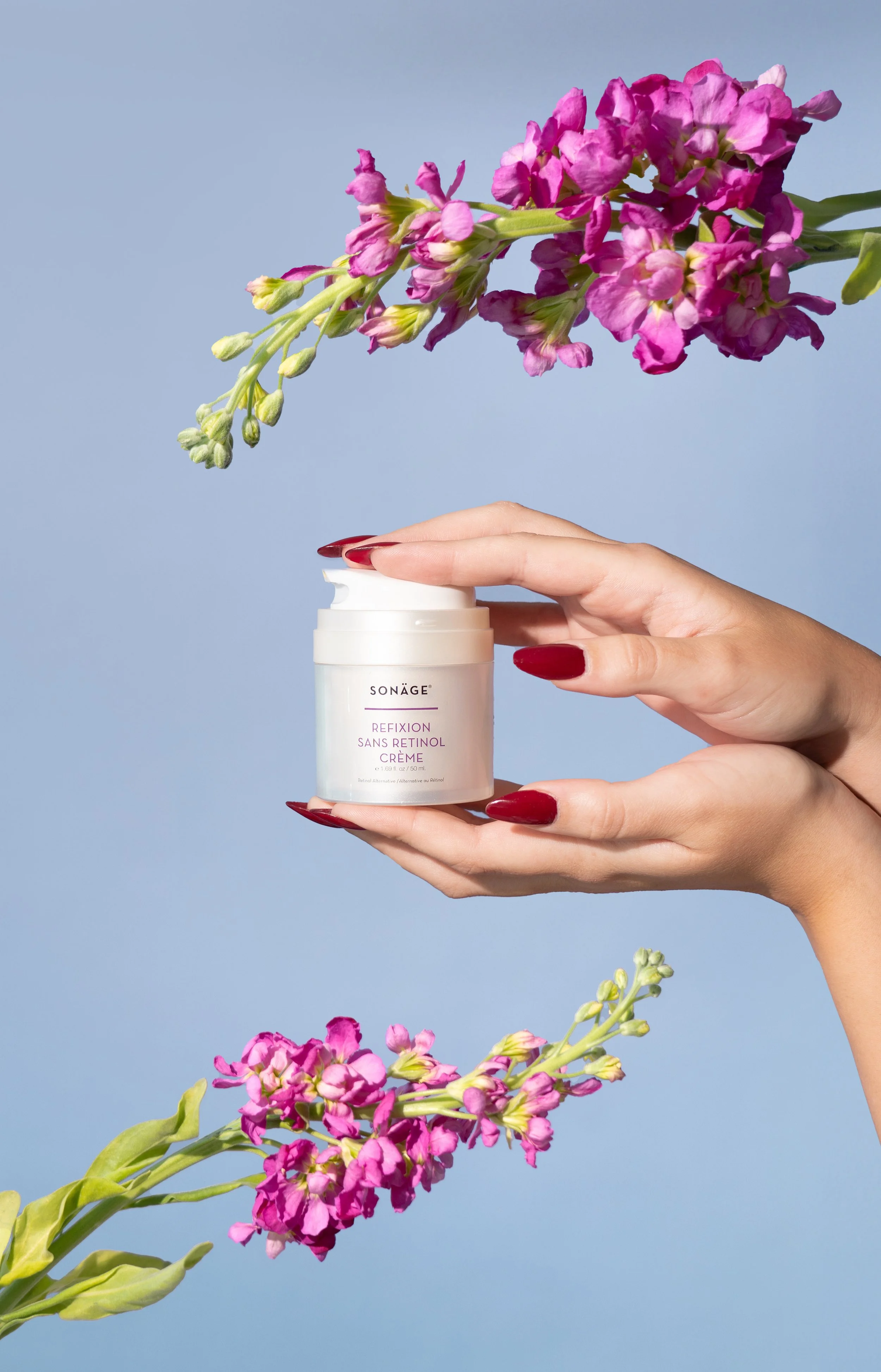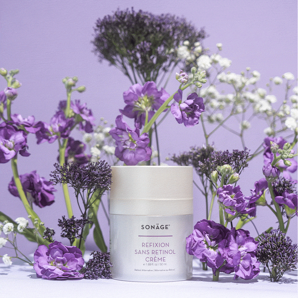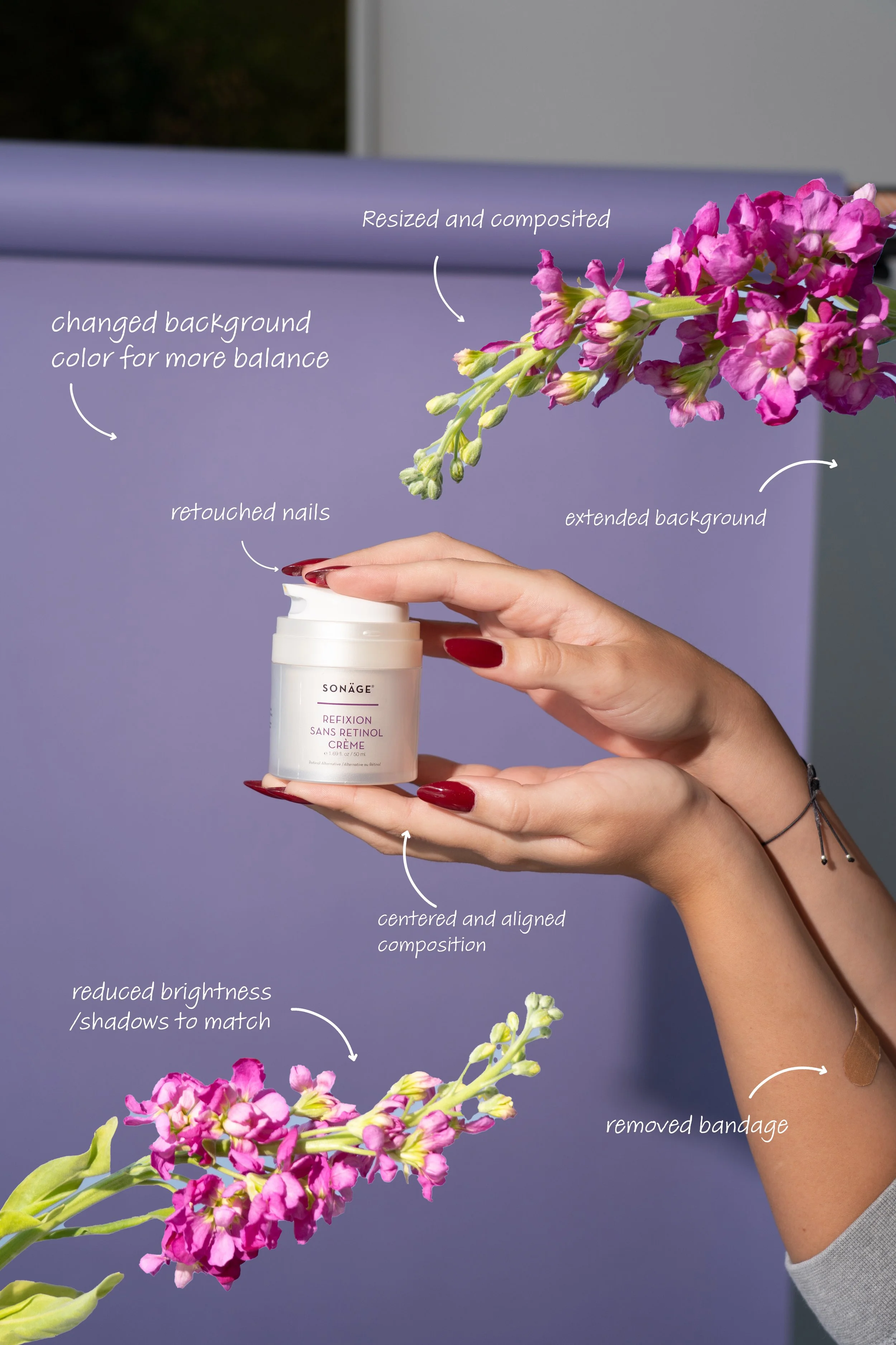 Sonage wanted to create a shoot highlighting Bakuchiol, the main anti-aging ingredient in their Refixion Sans Retinol Creme. Bakuchiol is a naturally occurring purple flowering plant, so I wanted to tie in the natural elements into the shoot and email graphics