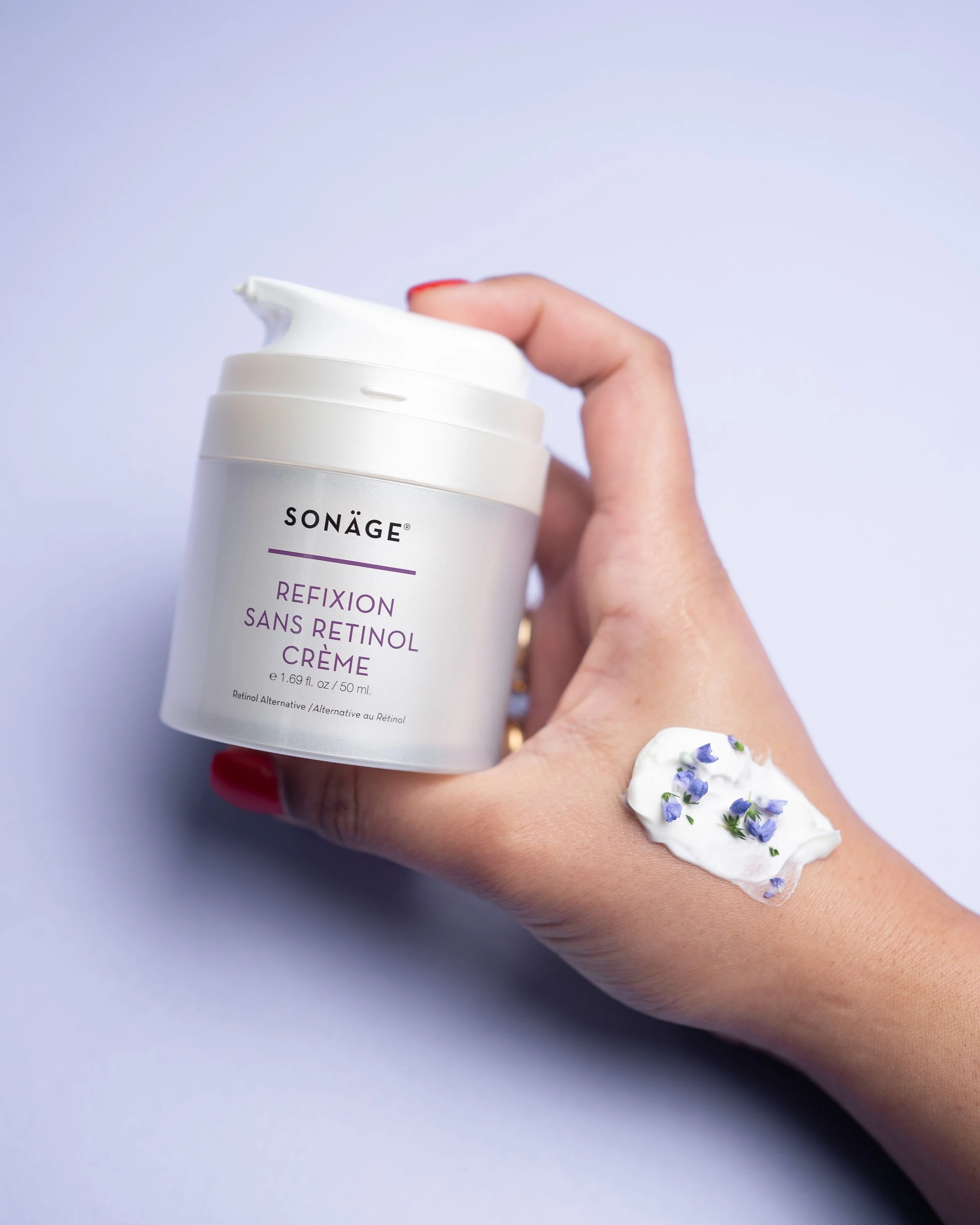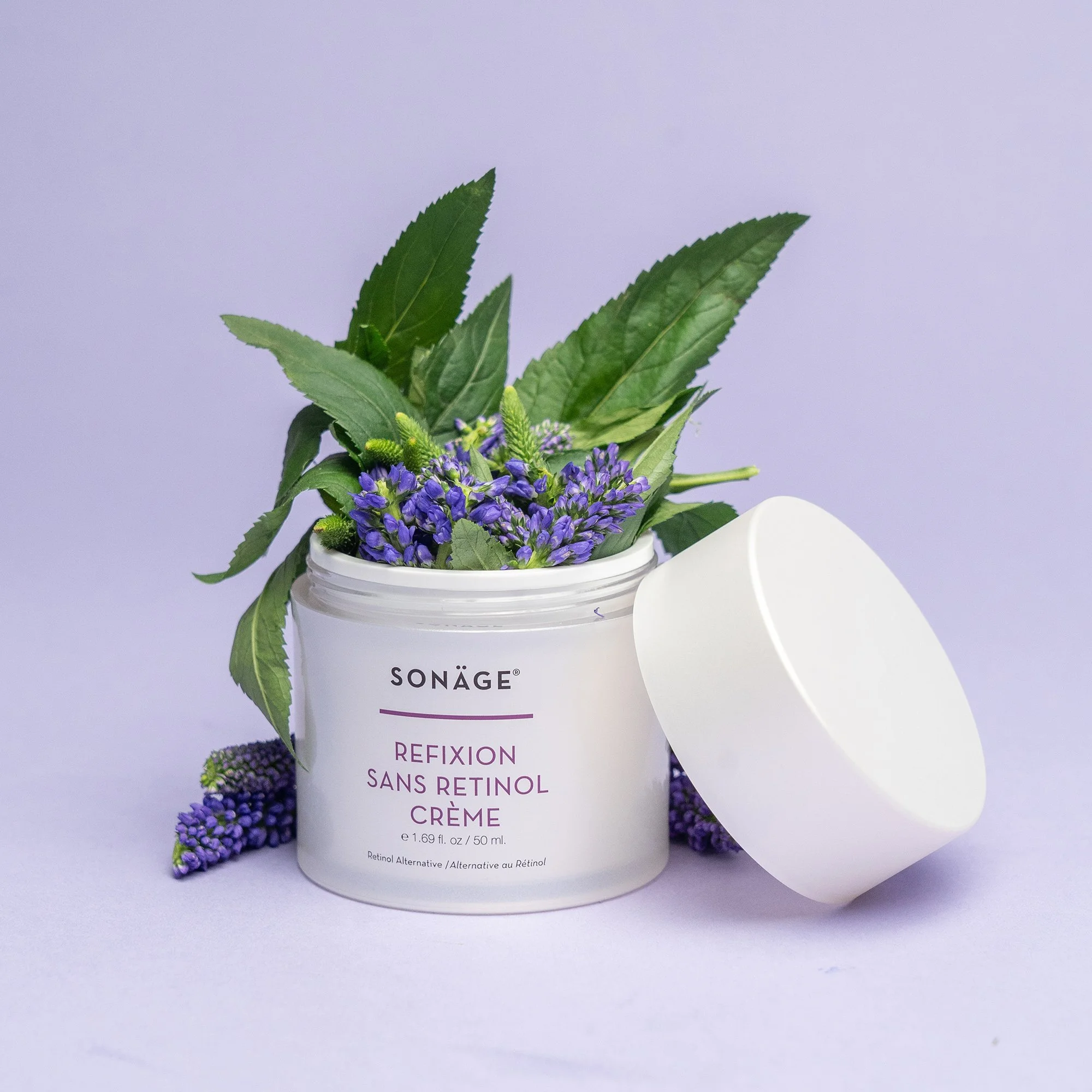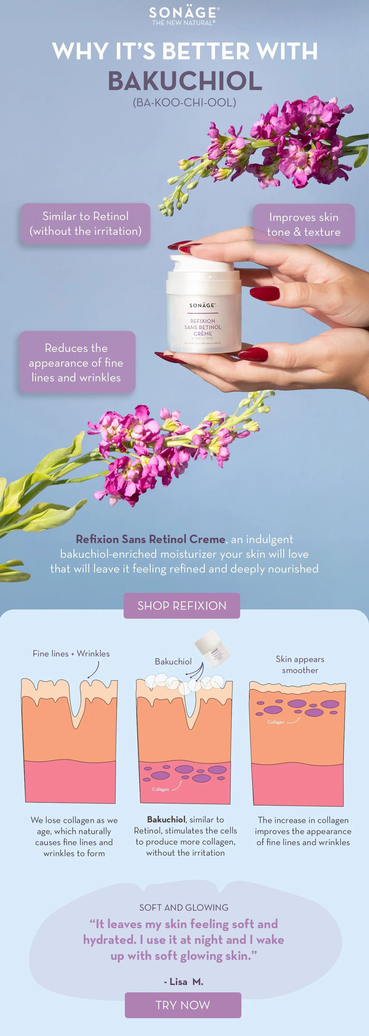 Sonage wanted to create a shoot highlighting Bakuchiol, the main anti-aging ingredient in their Refixion Sans Retinol Creme. Bakuchiol is a naturally occurring purple flowering plant, so I wanted to tie in the natural elements into the shoot and email graphics